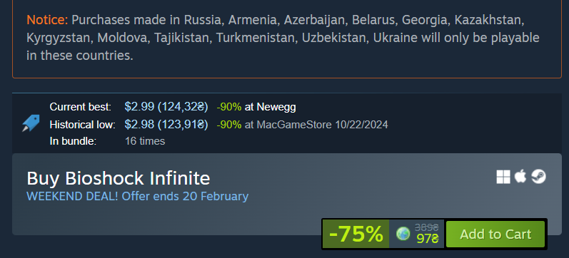 قبل از خرید یک بازی، سعی کنید ابتدا بررسی کنید که آیا آن بازی در ریجن شما تحریم است یا خیر. برای این کار، اگر ریجن اکانت شما اوکراین باشد، میتوانید توی خود استیم ببینید که آیا این بازی ریجن لاک شده است اصطلاحا یا خیر. من برای اینکه بتوانم واضحتر همه چیز را توضیح دهم، یک مثال میزنم. در حال حاضر بازی بایوشاک 3 در استیم، دو صفحه متفاوت دارد: یکی برای اکانتهای ریجن اوکراین و قزاقستان و دیگر کشورهای اروپای شرق، و یکی برای دیگر ریجنها. قبل از هر چیز، باید بگویم که این کار معمولا به یکی از سه دلیل زیر انجام میشود: