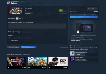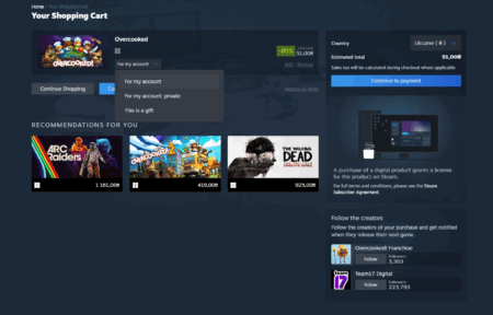 برای این کار، باید بسته به موجودی خودتان در اکانت، بازی موردنظرتان را انتخاب کنید. برای مثال من در عکس زیر، بازی overcooked را انتخاب کردهام. دقت کنید که باید انتخاب کنید این بازی را میخواهید برای خودتان (For My Account) بخرید یا به دوستی گیفت (This is a Gift) کنید. طبق عکس زیر، شما باید نوار را باز کنید و گزینه This is a Gift را انتخاب کنید.