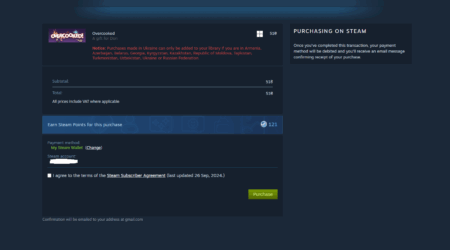 در این قسمت شما نیاز نیست چیزی را تغییر دهید یا کار خاصی انجام دهید، در متن گیفت هر چیزی که خواستید میتوانید بنویسید، برای مثال تولد دوست شماست، یک پیام تبریک مینویسید. استیم امکان ارسال گیفت برای زمان دیگر هم فراهم کرده است که در صورت تمایل میتوانید از آن هم استفاده کنید. در نظر میگیریم که شما متن را وارد کردید و میخواهید گیفت انجام شود. وقتی روی ادامه کار در مرحله پرداخت بزنید، اگر ارور دریافت نکنید و تصویر زیر بیاید، یعنی ریجن دوست شما با شما مشترک است و امکان گیفت کردن هست، اما اگر ریجنها متفاوت باشد، استیم در همین مرحله جلوی شما را میگیرد و اجازه گیفت را نمیدهد.